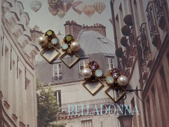 スワロフスキーとコットンパールにスクエアのチャームを組み合わせたピアスです。